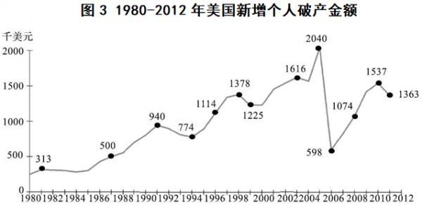 如图3所示,2005年《个人破产法》的修订,预期会使得个人破产门槛提升,通过破产来免除债务会变得更加困难,因而在2005年的前一两年内,个人破产金额急剧提升。2006年,在《个人破产法》修订通过后,个人破产金额仅为前一年的30%左右。其中2009年至2012年的高破产率,则反映了2008年以后经济衰退和不良贷款的影响。