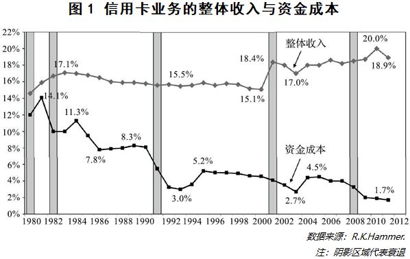 虽然一般情况下,人们可能认为,消费金融业务的收入会随着经济衰退期间利率的下降而减少(如果利率是浮动的),2010年和2011年这两年费用和刷卡增加的收入却抵消了利息减少的收入,使其总体收入保持不变。下图1显示了自1980年以来的信用卡平均收入与短期资金成本。