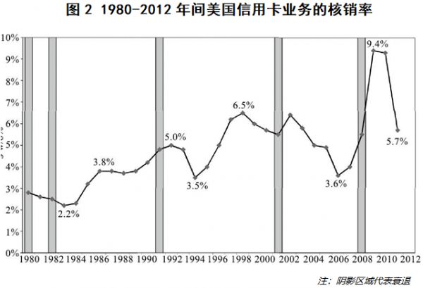 以1980-2012年间美国信用卡业务的数据来看,信用卡的实际核销率并不总是与经济周期直接相关。在经济繁荣期间,消费金融核销率下降,而在经济衰退期间,核销率会显著上升。