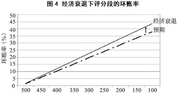经济衰退期间的一个关键问题是:征信系统的评分是否如经济繁荣时一样有效。对此,FICO的一项研究表明,征信评分仍然能够对用户进行分级,但每个评分级别的用户质量都在下降(见图4)。