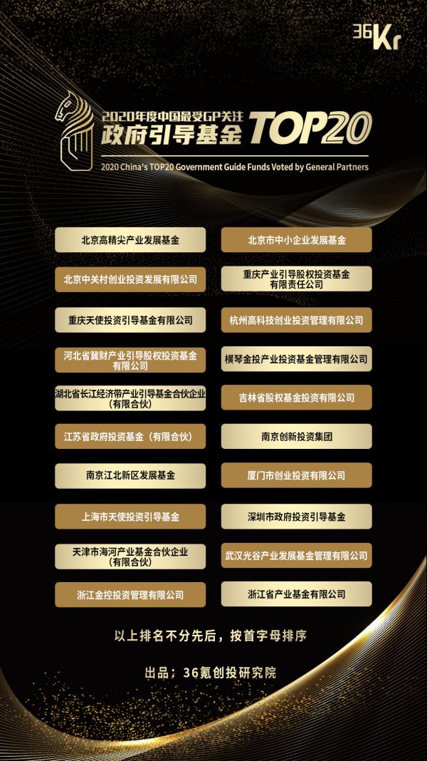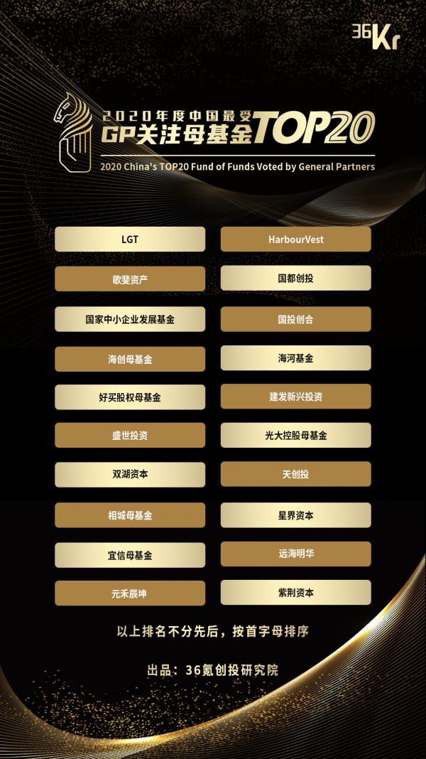 36氪重磅发布针对普通合伙人和有限合伙人的六大奖项:“2020年度中国最具潜力首次募资机构”、“2020年度中国黑马基金”、“2020年度中国最受LP认可投资机构”和“2020年度母基金直投”、“2020年度中国最受GP关注母基金”、“2020年度中国最受GP关注政府引导基金”。