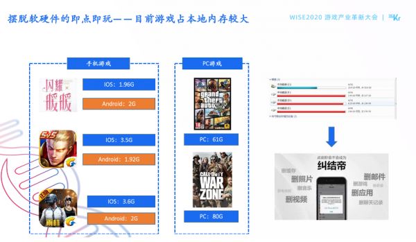如果大家经常打游戏,在手机上会下载比较多的游戏软件,大家可以仔细观察一下自己的用户行为,普遍习惯在wifi网络中下载,因为游戏包体很大。去年投资前做研究,我们把腾讯所有头部游戏拉出来,包体基本上平均在2G左右。还有一些更大的,比如米哈游的游戏,3D模型比较多,包体会更大一点。手游不光包体比较大,还未必和手机存储能匹配起来。