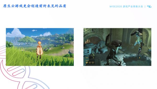 如图,这是今年两个比较重要的游戏,一个是年底将要发布的《原神》,画面品质已经到达了一定的高度,米哈游做的游戏不是每个手机都能跑得起来,对于硬件的要求比较高。右图是今年爆火的VR游戏Half-life Alyx,它们通过VR能实现比较好的视频体验和光追效果。但是未来原生的云游戏完全在云端开发、云端运行的话,可以达到比这两种画面更好的效果。
