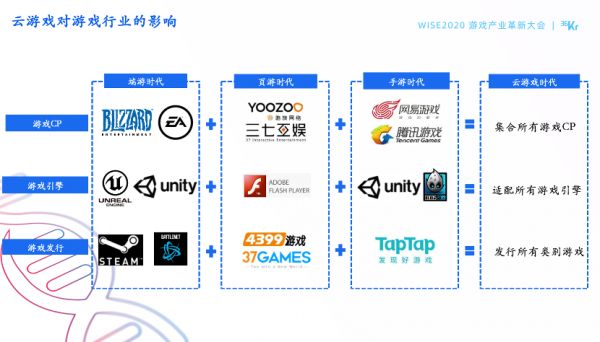 我们分三类公司,游戏CP、游戏引擎、游戏发行,在不同的终端年代都用了不同的技术解决方案。在云游戏时代,我们认为云游戏可以集合所有游戏CP,适配所有的引擎,发行所有类别的游戏,就像三七说的不再切分端游、手游还是页游。