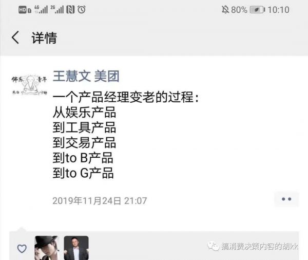 上面在战略那部分其实有提到,同时具备C端内容和B端商业经验&视角&思维的同学是不多的,但以我个人的经历来看,同时具备C/B两端的经验&视角&思维太重要了。后来看到一张广为流传的王慧文PYQ截图,真是很有共鸣。