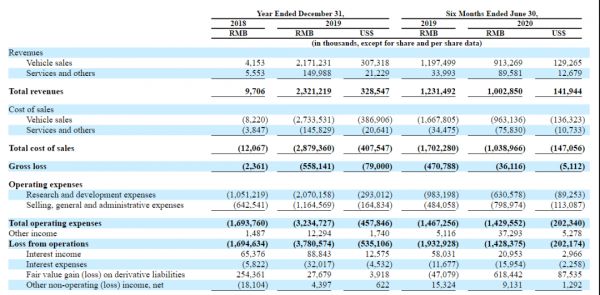 数据来看,今年上半年,小鹏收入1.419亿美元,较2019年的同期下降了19%,在亏损上,小鹏较去年同比收窄了59%至1.126亿美元。小鹏收入的主要来源是汽车销售,为1.29亿美元,而汽车销售的成本为1.36亿美元。换句话说——单纯卖车对当前的小鹏来说其实是赔本买卖。