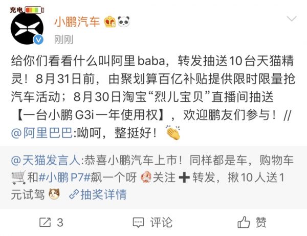 而作为股东的阿里巴巴,在小鹏上市首日也送出了“特别”的祝福。8月27日晚,“聚划算百亿补贴”宣布补贴小鹏汽车,限量每台补贴5万元,此外还将给予小鹏所有车型每台2000元的限时购车补贴。