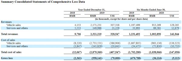 招股书显示,2019年小鹏汽车收入为23.2亿人民币,较2018年增长逾238倍,服务及其他收入1.5亿,较2018年增长26倍。2020年上半年,小鹏汽车营收为10.03亿人民币,毛利为-3611.6万,毛利率为-3.6%,较上年同期的-38.23%大幅提升。