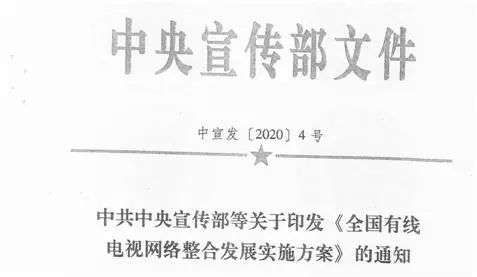早在3月份,中宣部就印发了[2020]4号文件《全国有线电视网络整合发展实施方案》。