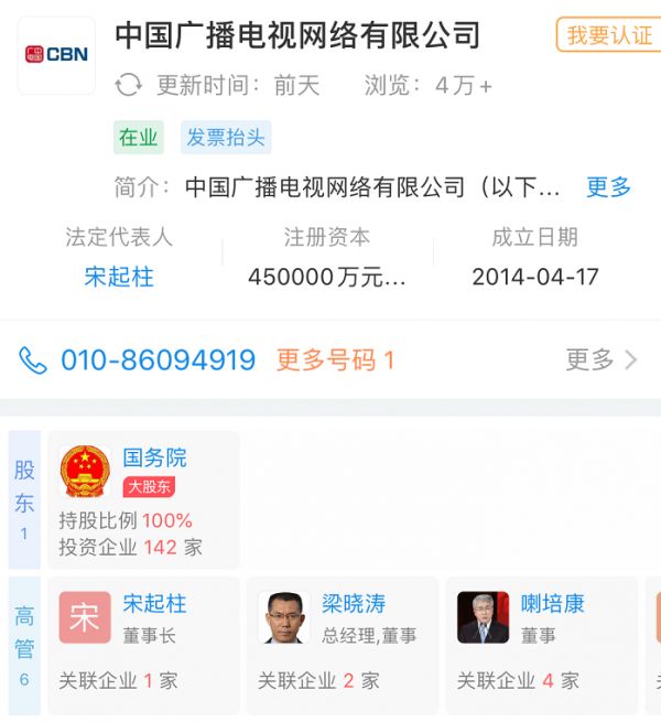 “国家广电总局”为国务院直属机构,“中国广播电视网络有限公司”是由财政部出资,国家广电总局负责组建和代管的国有独资企业,国务院持股100%。