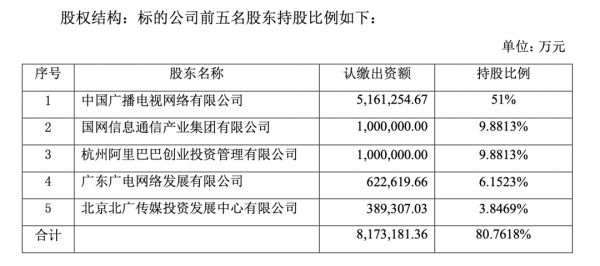 此次参与组建中国广电的公司有47家。其中,阿里巴巴和国网信息通信产业集团(由国家电网全资控股)各出资100亿元,持股比例9.8813%,并列为中国广电第二大股东。第四、第五大股东为广东广电网络和北广传媒。