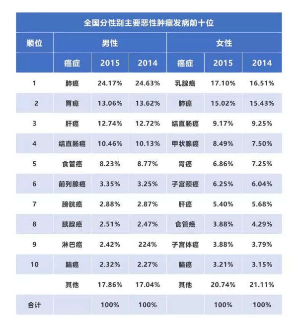 全国分性别主要恶性肿瘤发病前十位