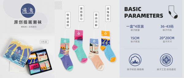 袜子星球的产品分为两类:一是原创系列;二是IP合作。杨索娜表示,原创系列是袜子星球产品的重心,全网独家IP,拥有美术版权和外观专利。公司原创设计师来源于固定合作的工作室、新锐艺术家等。袜子星球以2020年疫情为主题,推出“逃逸”系列主题中筒袜,包括情迷迪拜、塞班落日、塞纳河畔、洱海阳光等主题。