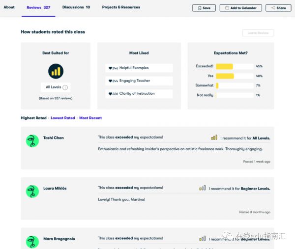 评价反馈机制。Skillshare参考电商零售平台机制,“在学习社区中实施信任和声誉机制”。如下图,每个教学视频下,有评分评价区: