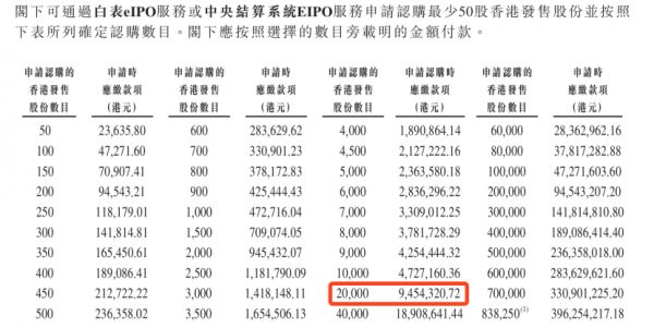 按照申请数目要求,至少认购400手(20000股,945万港元)方可进入乙组。