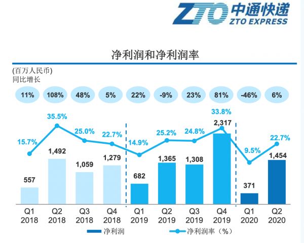 根据中通快递8月13日公布的季度报告,在新冠疫情缓解后,多家快递公司都开始恢复元气,而中通快递在第二季业绩表现不错,2020年二季度,中通快递完成业务量46亿件,同比增长47.9%,市场份额同比提升1.6个百分点至21.5%。