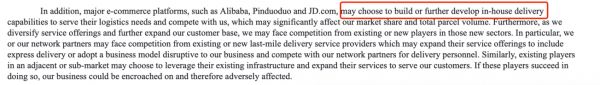 在中通快递最新呈交给美国证监会的文件中,曾多次提到,像阿里巴巴这样的电商平台,未来很可能建立自有的快递网络,也有可能会对中通快递在行业内的竞争对手加大投资,不管哪个方面,都有可能对中通未来的市场份额产生不利影响。