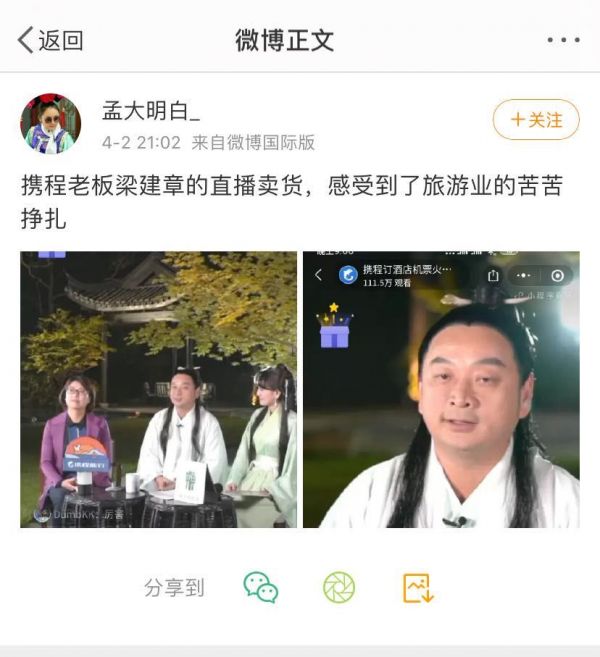 已经过去的五个多月里,梁建章以每周一次的频率,马不停蹄做了20余场直播,在这些直播中,他不再以西装革履的形象示人,而是cosplay成各路角色,唯一目的就是吸引用户注意,为不同的旅游产品带货。