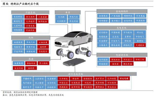 以特斯拉为例,其产业链涉及的供应商分为动力总成系统、电驱系统、充电、底盘、车身、其他构件、中控系统、内饰和外饰九个部分。目前已经进入特斯拉上海工厂供应链的零部件厂商主要集中于动力电池、金属结构件、热管理、内外饰、电子电气等领域。