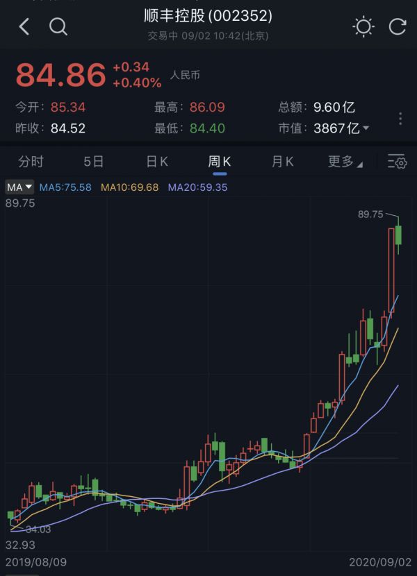 真正的大爆发是在今年。年初以来,顺丰股价首次突破80元以上、翻了一倍,市值也创下新高,超过三通一达、百世、德邦等竞争对手市值之和。作为公司实控人,王卫目前持股超60%,截至9月2日,顺丰控股市值超3800亿,以此计算,王卫身价超过2200亿。