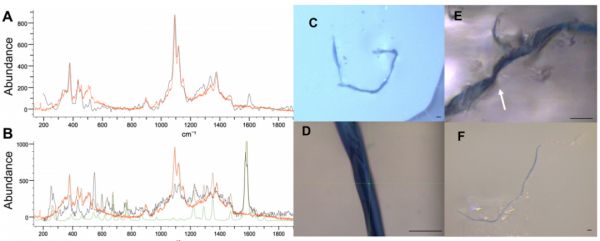 上图各部分分别表示:(A)废水处理厂废水中的纤维素;(B)北极沉积物中的纤维素靛蓝染料复合材料;(C)北极沉积物中发现的靛蓝牛仔纤维;(D)五大湖鱼中的牛仔纤维;(E)污水处理厂污水中的牛仔纤维;(F)从洗涤废水中收集的牛仔纤维。