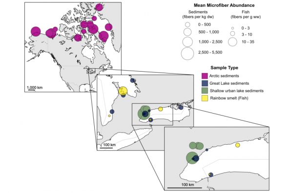 研究人员采用显微镜和拉曼光谱技术相结合的方法,在 2014 年至 2019 年期间,分别从加拿大北极群岛、劳伦森大湖和安大略省南部浅层郊区湖泊进行水样采集,采样范围涉及湖底沉积物和湖边污水处理厂中的水样,然后从中对靛蓝色牛仔布微纤维进行鉴定和计数。结果发现,在所有的环境样品检测中,微纤维非常普遍。