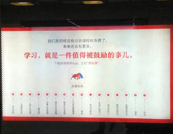 在北京做行政文员的彭雅雅第一次对在线成人教育动了念头,是在一个加完班的夜晚。疲惫的她站在站台前,一边玩手机一边等待着地铁呼啸而来,无意间一抬头,看见了“尚德机构”印在玻璃上的广告,“学习,就是一件值得被鼓励的事儿。”