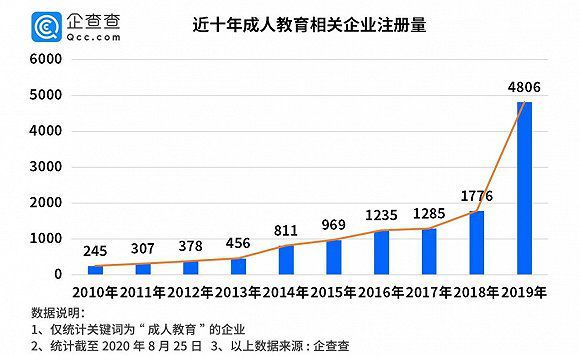 有数据显示,相关企业注册量从2019年开始出现暴增,目前我国共有4.9万家成人教育相关企业,其中2019年的年注册量陡然升至4806家,同比增长171%。