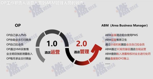 燃财经拿到的资料显示,OYO称中国2.0模式是1.0模式的巨大颠覆。原有的BD和OP的职责都发生了非常大的变化,原有的BD(商务拓展)岗位被调整为AM(资产经理)岗位,OP(运营团队)岗位被调整为ABM(区域商业管理)岗位。这恐怕也是OYO现在进行大规模裁撤OP和BD岗位的原因。