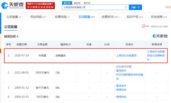 天眼查显示,近日,豆瓣内资公司北京豆网科技有限公司(以下简称:豆网科技)进行了新一轮战略融资。投资方为上海世纪出版集团,交易金额与投后估值均未透露。