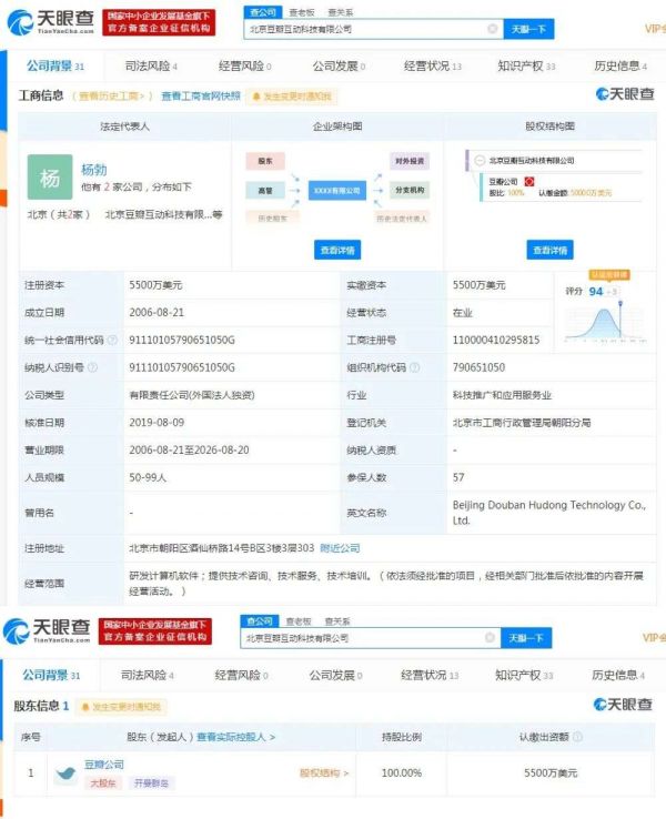 记者查询发现,豆瓣的主体公司为北京豆瓣互动科技有限公司,阿北为公司法人,该公司成立于2006年8月,注册资本5500万美元,唯一股东是一家注册在开曼群岛的境外公司。