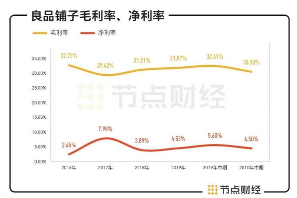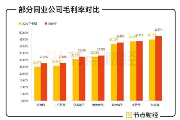 高端化,最显而易见的就是售价提高,相应地,毛利率也应该提高。但事实是,2020年上半年,良品铺子的毛利率不升反降,下降了1.96个百分点,甚至不及2016年水平;净利率只有4.5%。