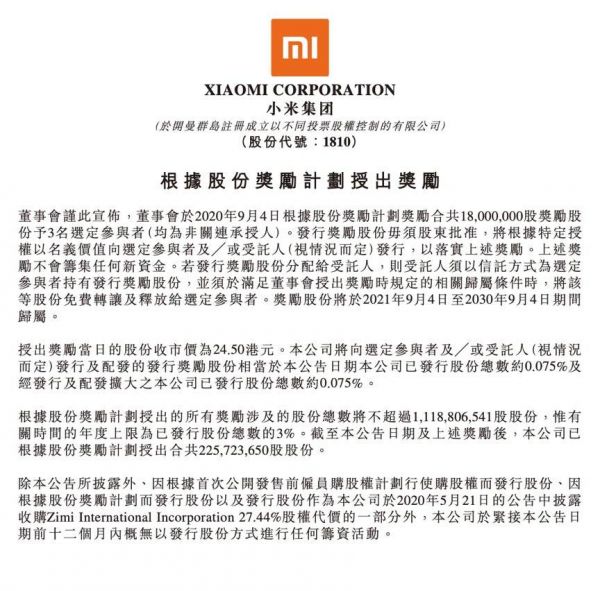 投资界(ID:pedaily2012)消息,9月4日晚间小米集团-W(01810)发布公告,董事会于2020年9月4日根据股份奖励计划奖励合共1800万股奖励股份予3名选定参与者(均为非关连承授人)。