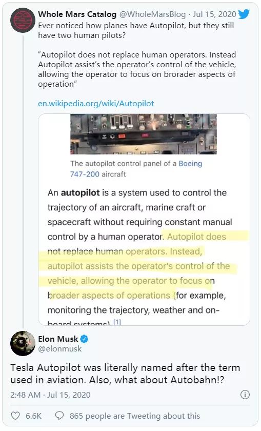 而马斯克的回复是,“特斯拉自动驾驶(Autopilot)是根据航空业使用的术语来命名的。德国高速公路称作‘Autobahn’,那它是不是也要改名呢?”