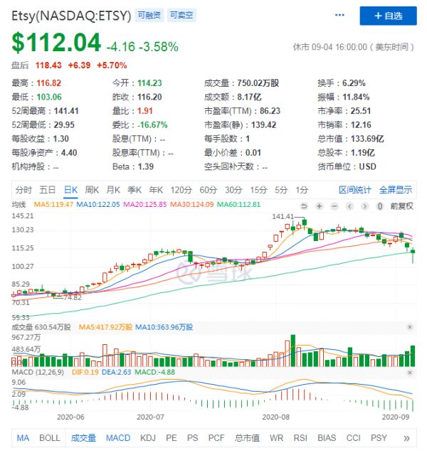 Etsy是美国一个在线销售手工工艺品的网站,网站集聚了一大批极富影响力和号召力的手工艺术品设计师。步入5月以来,Etsy股价就进入刷新历史新高的轨迹。从60到70到80,直到现在股价来到112美元。截止目前,Etsy周五盘后股价为118.43美元,市值为133.69亿美元。