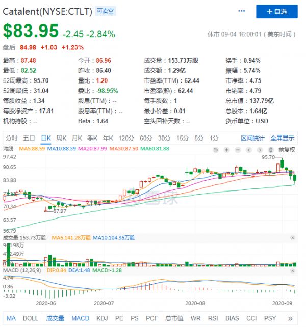 今年以来,Catalent上涨近48%。截至目前,Catalent周五盘后价为84.98美元,市值为137.79亿美元。