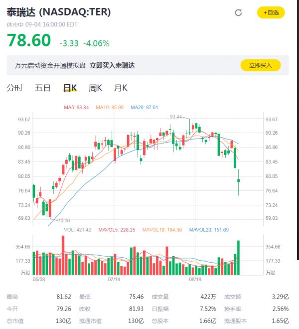 泰瑞达是全球著名的自动测试设备(Automatic Test Equipment)供应商· 泰瑞达的测试产品主要用于半导体,板测试,声频,宽频电话网络生产厂家。今年以来,Teradyne股价上涨近13%。截至目前,Teradyne周五收盘价为78.60美元,市值为130亿美元。