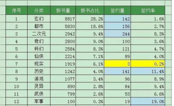 对比而言,起点的作者甚至满足签约条件都很难。奉义天涯出示的一张起点单月的新书签约率,不同类型分区内,签约率普遍不超过10%,也就是说,90%以上的作者甚至没有获得收入的权利。
