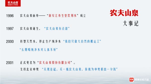 当时他高调宣称农夫山泉不再生产纯净水,全部生产天然水。这直接就把矛头指向了当时生产纯净水的娃哈哈、乐百氏,以至于后来双方还去法院闹了一通。