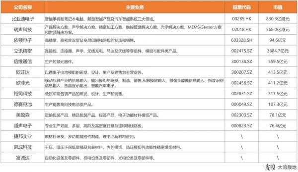 这些公司分别为瑞声科技、京东方、比亚迪、宏明双新、超声印制板、歌尔股份、依顿电子、捷邦实业、长电科技、利源精制、金龙机电、中石伟业、科森科技、蓝思科技、立讯精密、领益智造、美盈森、欧菲光、凯成科技、山东创新、德赛电池、富诚达、信维通信、裕同科技、欣旺达、安洁科技、东山精密和正和科技等。