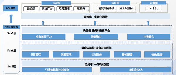 快盘已经搭建了PaaS+SaaS的云服务体系。PaaS层采用混合云架构,包括设备管理、调度管理、镜像挂载等功能,SaaS层则是业务管理平台,负责场景输出、内容接入,并对接各内容终端。最终,快盘想将云游戏当成内容切入点,既从头部游戏厂商处获取优质内容,也与流量平台建立合作。除了游戏,快盘也会逐渐延伸其他云内容,并逐步拓展到手机、PAD、VR以及其他可穿戴设备等各个IOT屏幕,实现对更全内容及场景的覆盖。