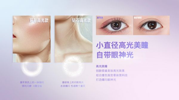 基于此,团队今年5月底上新了一款“高光美瞳”,结合彩妆里的高光概念,能让眼睛看起来更有神。和塑造脸部轮廓的高光一样,通过渐变的花纹以及渐变印染技术设计了高光美瞳,做到模仿「环形灯」的效果,在美瞳上面做了明暗渐变的对比处理。
