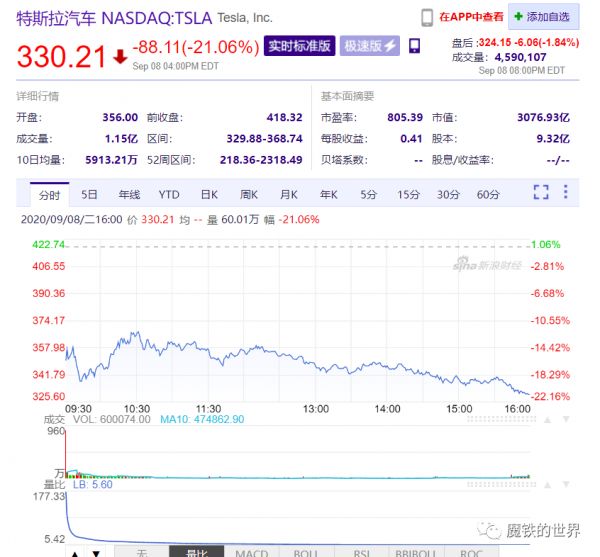 特斯拉是造电动汽车的,但对创始人马斯克来说,特斯拉更像是一辆财富过山车。不过,这辆车不是从山谷往山顶狂飙,而是自山顶往山谷坠落。美东时间9月8日,特斯拉股票暴跌21.06%,市值缩水821.19亿美元,等于一天跌去1个通用汽车和1.28个福特汽车。