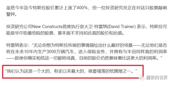 Toni Sacconaghi还算是看空特斯拉的分析师中比较客气的,投资研究公司New Constructs首席执行官大卫·特雷纳(David Trainer)则毫不客气,他认为特斯拉是华尔街最危险的股票,只值50美元/股,“我们认为这是一个大的,有史以来最大的,就要塌落的纸牌屋之一。”