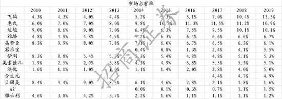 但到了2019年,贝因美婴幼儿配方奶粉的市场占有率仅为1.6%,位列第十一位,较2011年呈断崖式的下降,原因与公司业绩下降的理由相同。