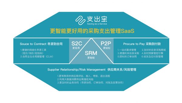 战略寻源产品(从寻源到合同S2C)主要是对接供应商,提供线上寻源管理平台,同时对供应商的资质、履约进行监控。通过询比价、竞价、招投标、供应商风险背调等模块,支出宝让采购部门从传统的执行采购向战略采购转型,同时也为供应商提供了透明的交易平台。