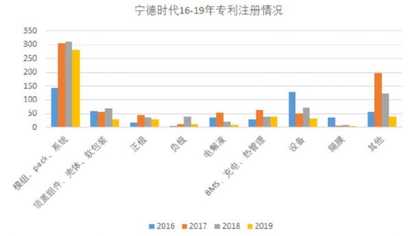 从专利注册情况来看,宁德时代除了在老本行电池包技术上实力雄厚外,在正极、负极、电解液、隔膜等锂电整条产业链上也都有不俗的积累。