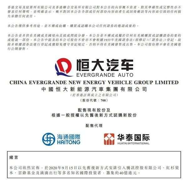 9月15日,恒大汽车发布公告称,已以配售新股的方式获得将近40亿港元(约合为34.2亿人民币)的投资,这也是恒大汽车首次公开募资。