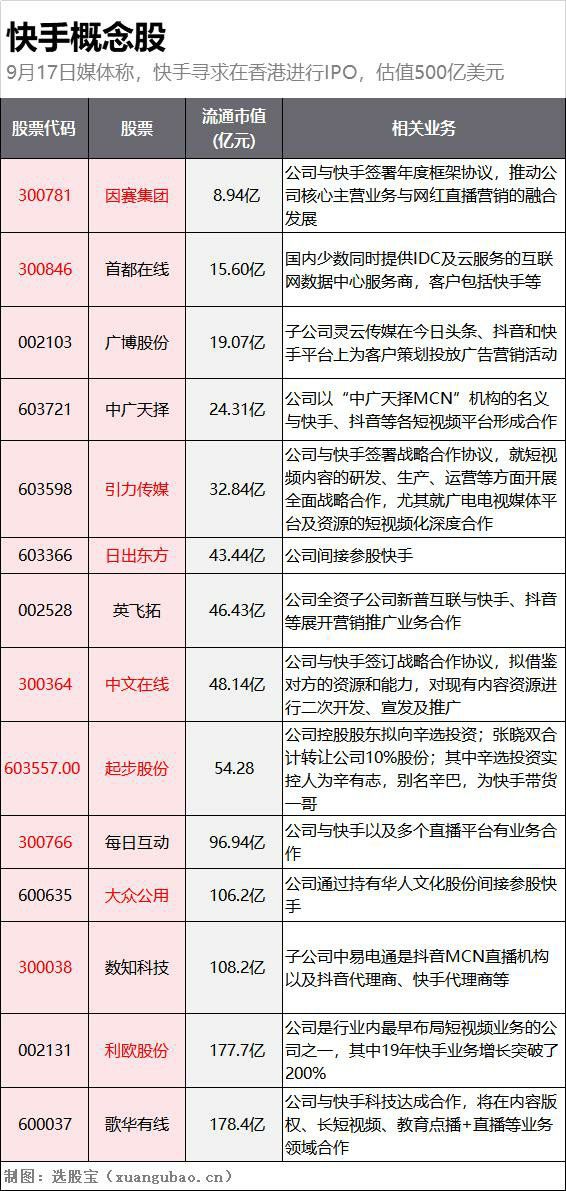 随着快手IPO消息的传出,9月17日午后开盘,A股市场中多只快手概念股发生异动,盘中首都在线暴涨20%一度封板,日出东方直线封板,因赛集团涨超7%,大众公用、引力传媒等跟涨。截至收盘,首都在线涨16.28%,报收32.50元/股。日出东方涨5.77%,报收5.68元/股。因赛集团涨5.34%,报收33.72元/股。