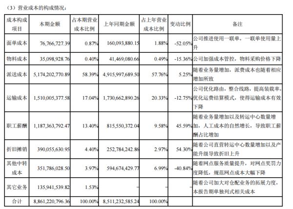 具体而言,快递行业的营业成本主要由派送成本、运输成本、中转站职工薪酬等几部分组成。以申通快递2020年中报为例,派送成本在总营收成本中的占比达到58.39%,运输成本和职工薪酬则分别占比17.04%和13.4%,三项成本合计占总营收成本的88.83%。